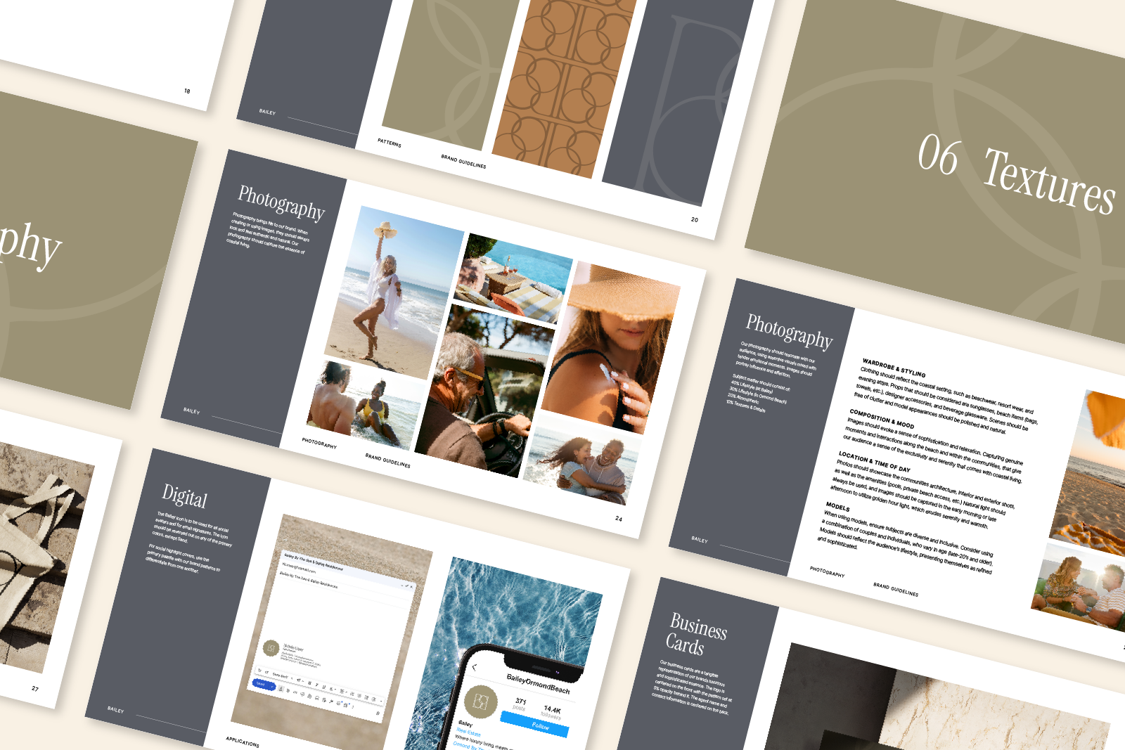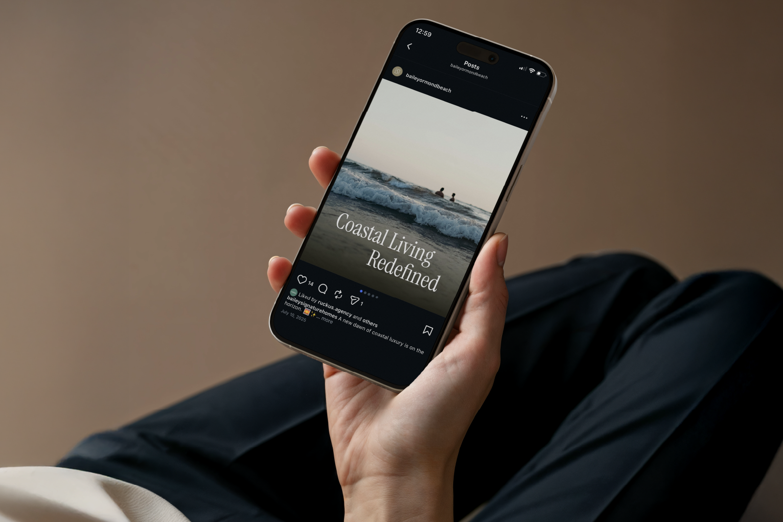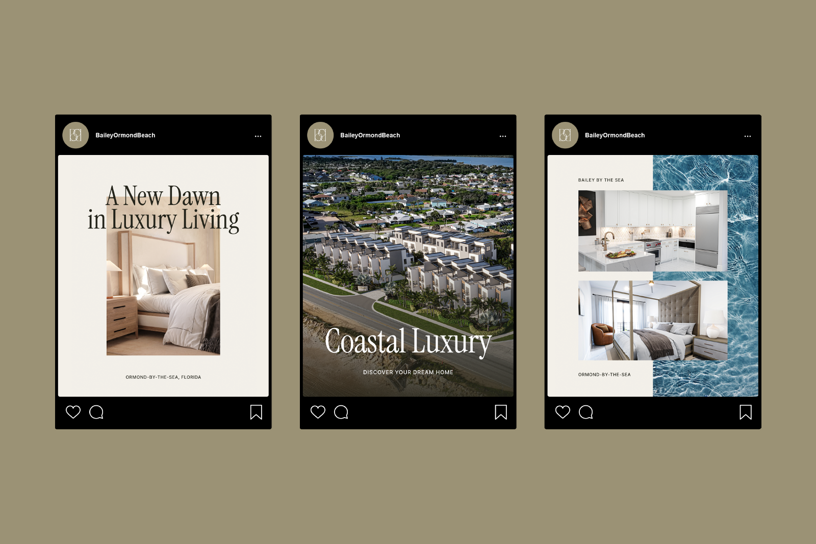 The brand was launched across multiple channels — social media, digital and search-based marketing, targeted email campaigns, and direct sales support for the brokerage — with the beachfront location positioned as the centerpiece of every touchpoint. At the heart of the creative system is a stylized "B" built from grille-inspired line work, designed to carry through both marketing applications and architectural elements such as entry gates. The visual identity leans into warmth, luxury, and coastal comfort, speaking directly to high-end buyers seeking an oceanfront retreat — whether as a primary residence or a getaway. Distribution is primarily digital, spanning social, video, and online platforms, with future plans for targeted audio and video streaming. The guiding idea, "Coastal Living Redefined," does double duty: it signals a new opportunity for upscale oceanfront living while also marking the debut of a new brand as The Bailey Group's first offering — capturing the essence of what these properties stand for, a reimagined vision of tropical, luxury coastal life.